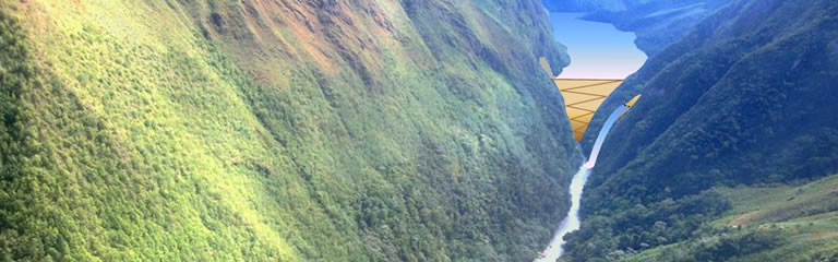 Presa: Tipo enrocado con cara de concreto, 199 m de altura y 273 m de longitud de corona, servirá para embalsar 375 hm3 en un área de 5 km2.